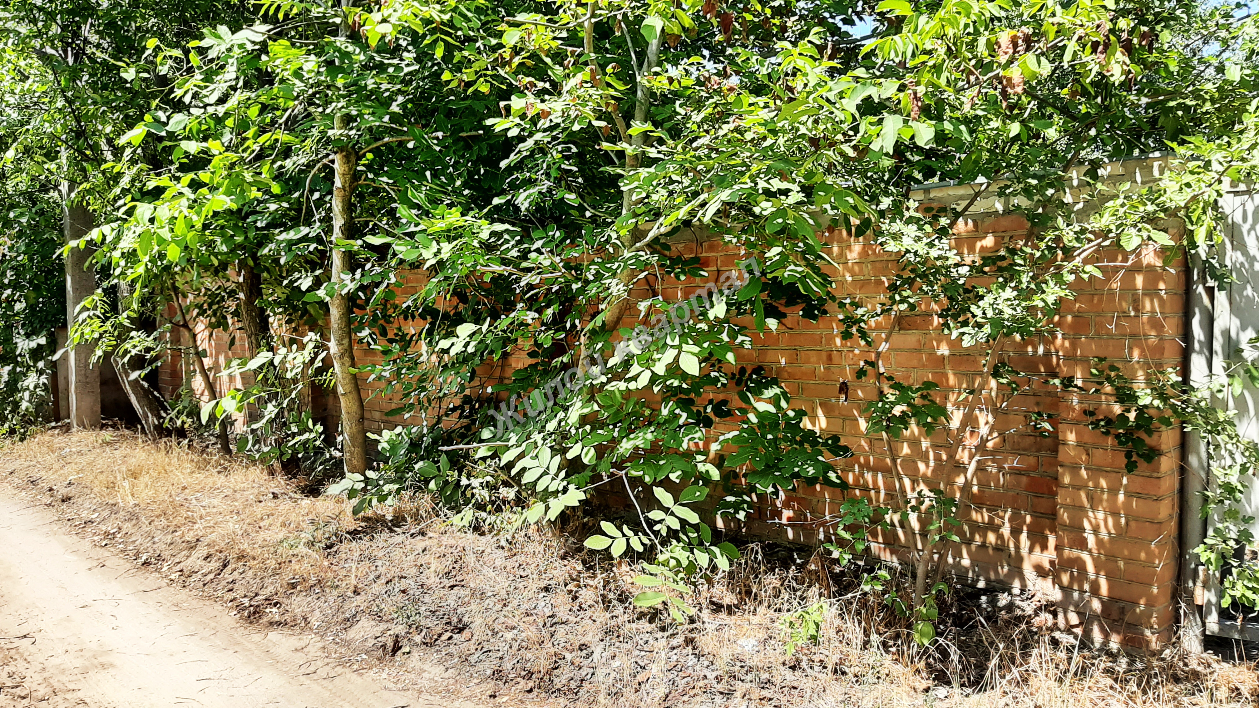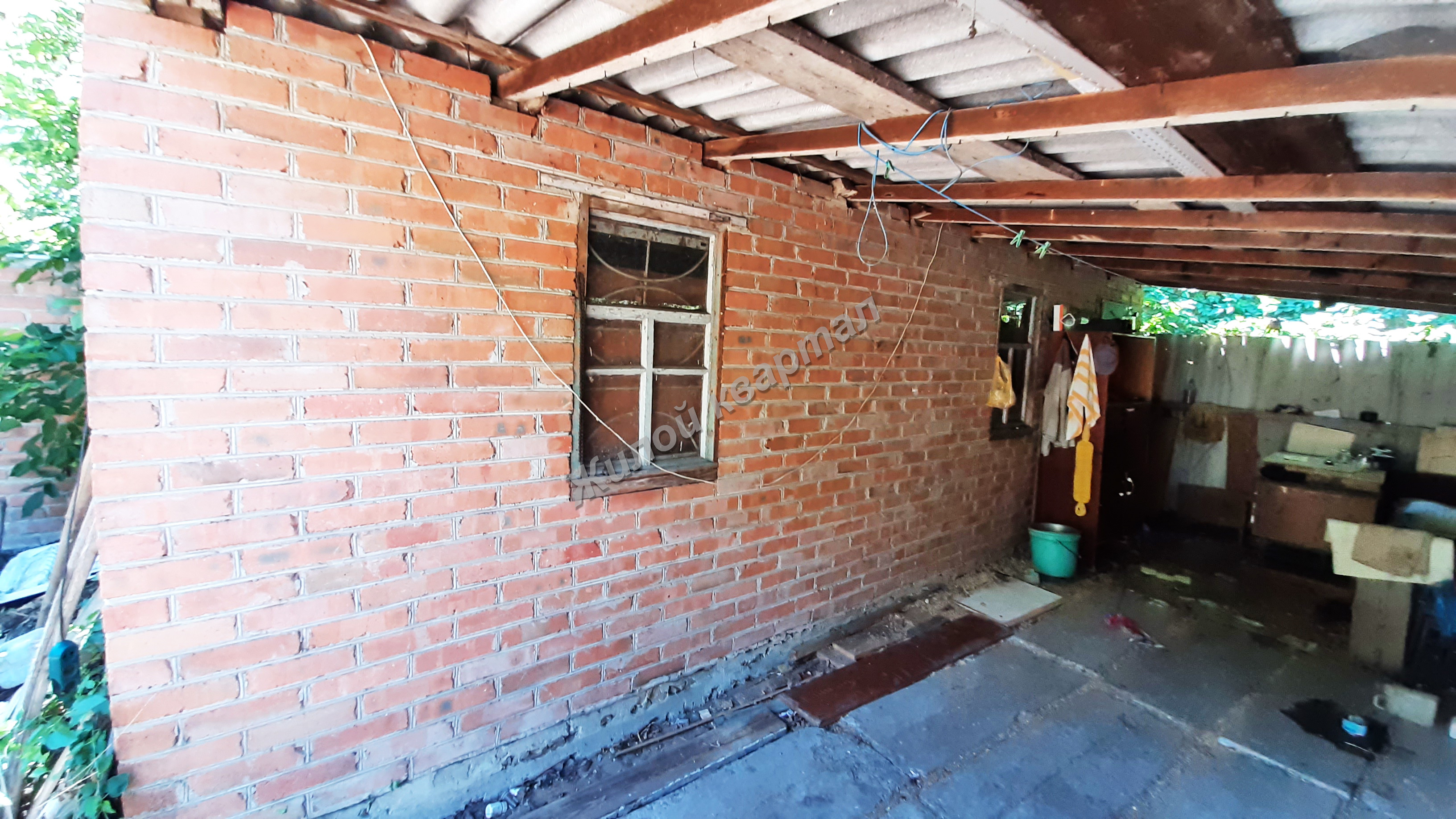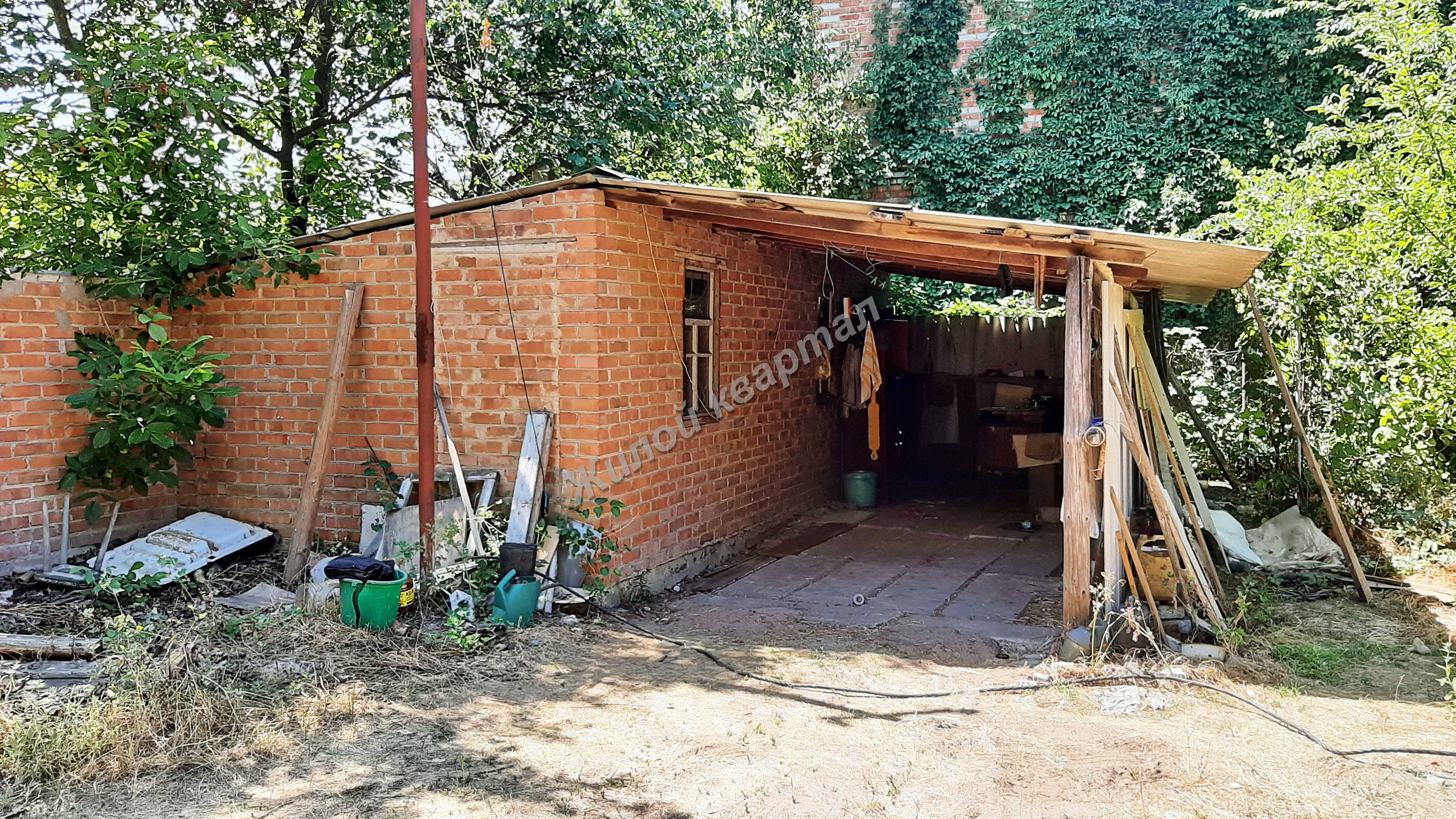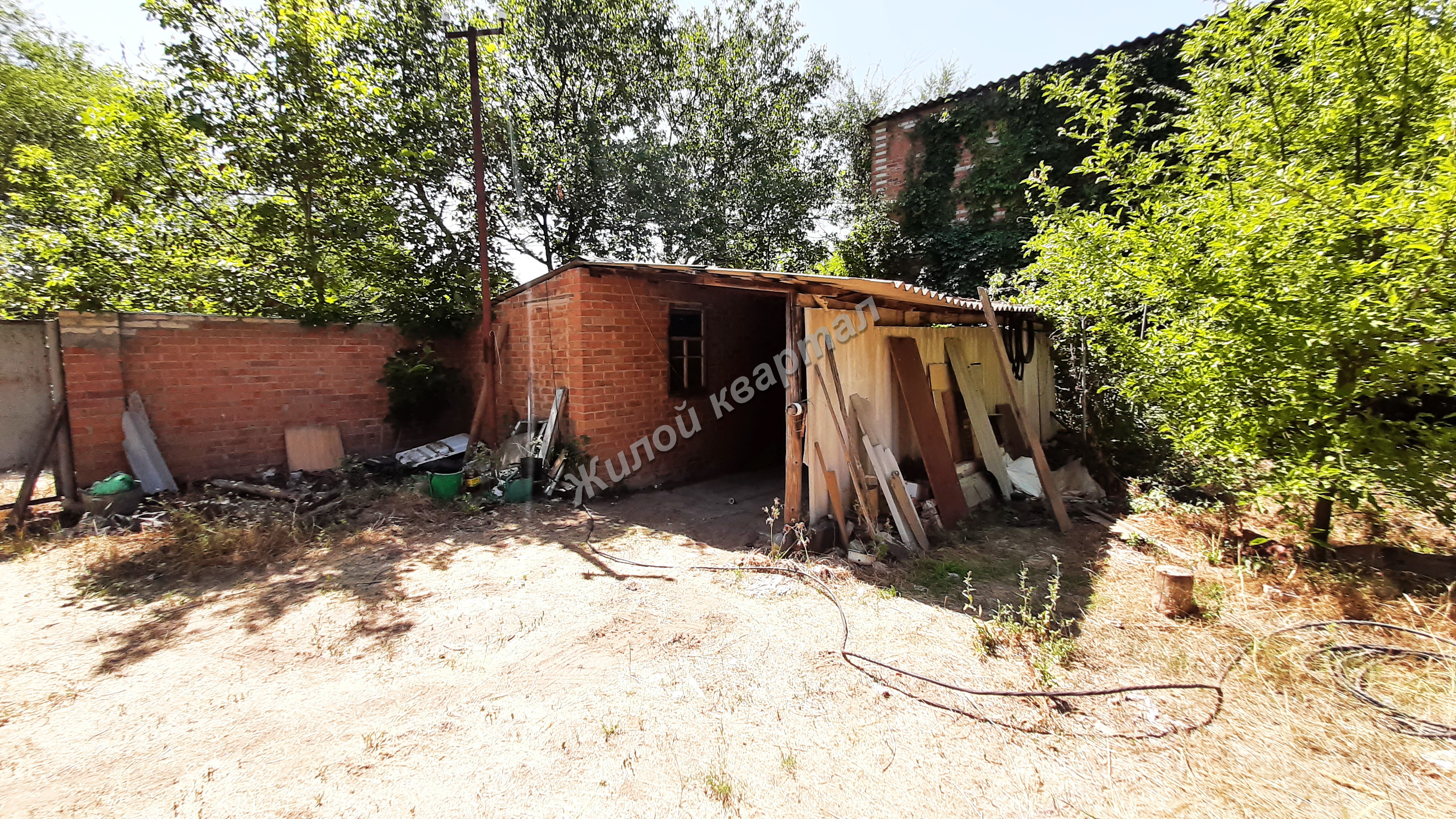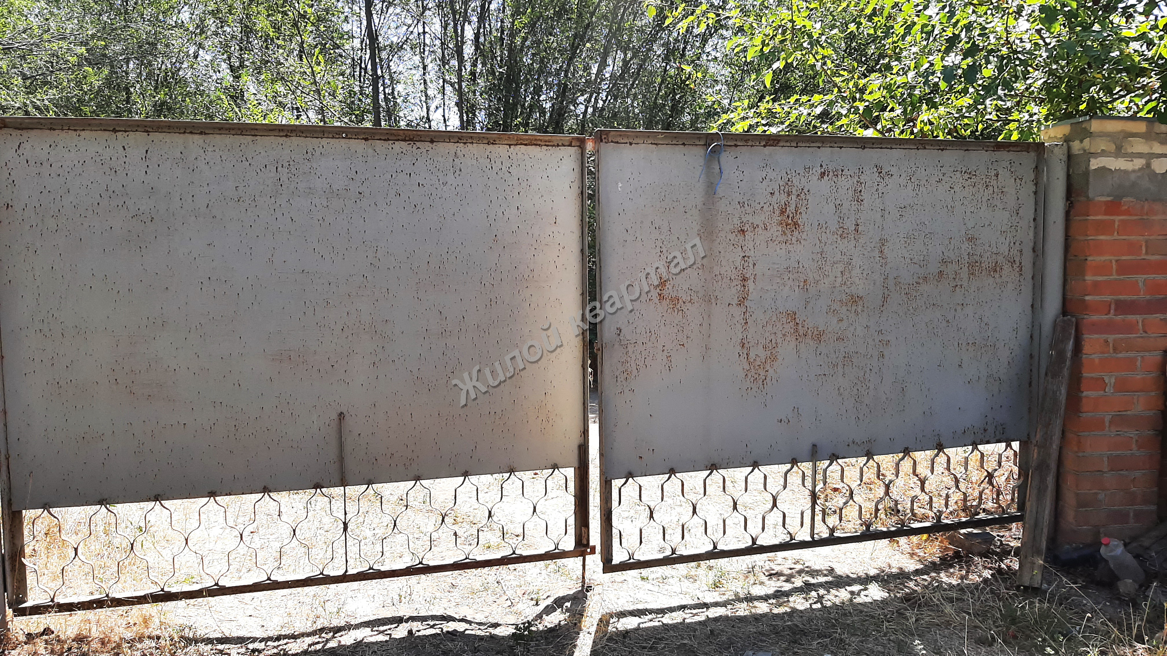 Забор кирпичный, ворота металлические, навес.